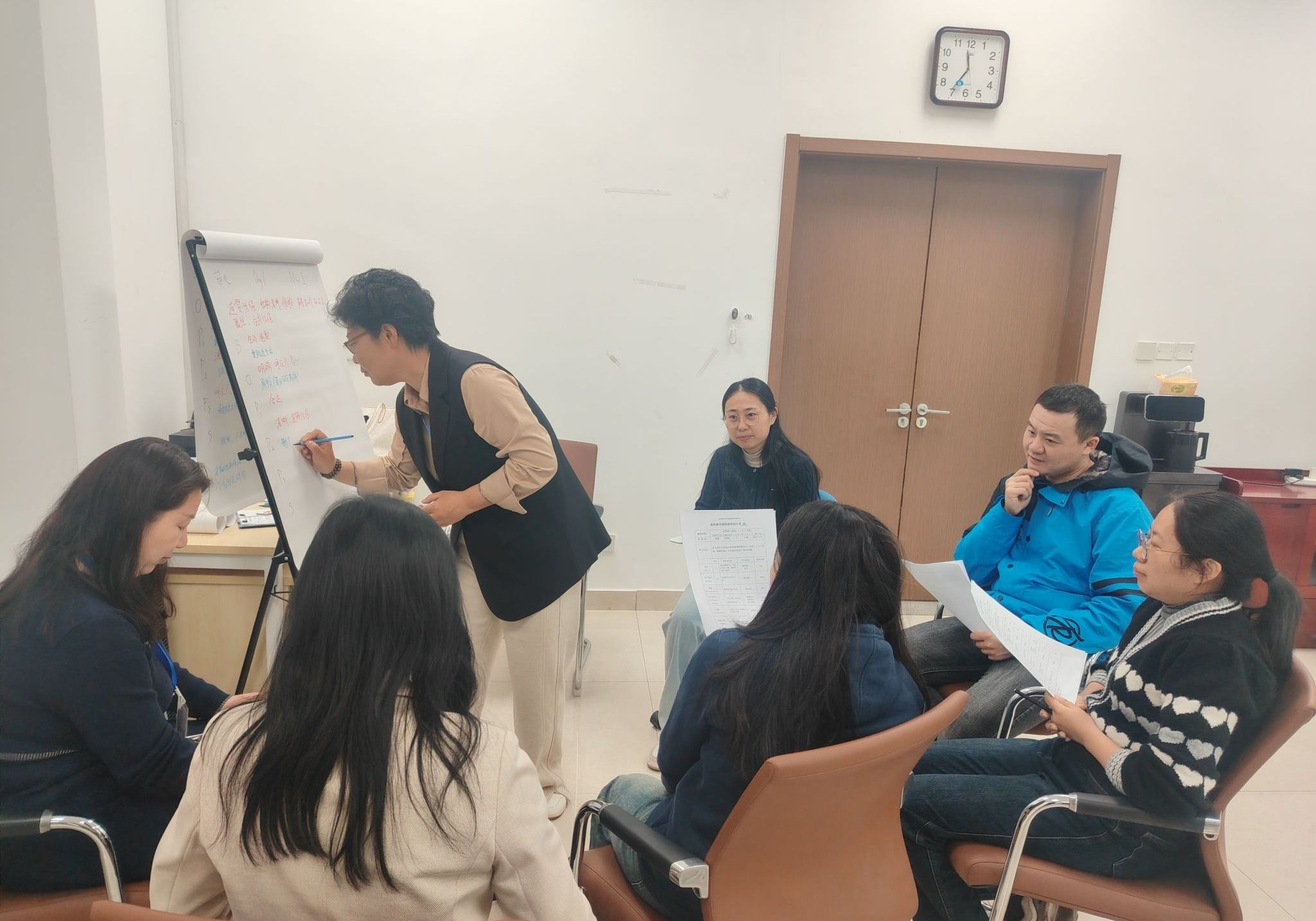 培训期间,引导员结合多年教学经验与前沿教学理论,为学员提供专业指导。通过案例分析,他们将抽象理论转化为具体教学情境;组织小组研讨,促进学员间的深入交流与思维碰撞;开展一对一指导,针对学员个性化问题提出改进建议。在引导员的悉心指导下,学员系统掌握了BOPPPS有效教学结构、多元化教学策略、课堂互动设计等核心教学技能,对构建高效课堂有了更深入的理解。