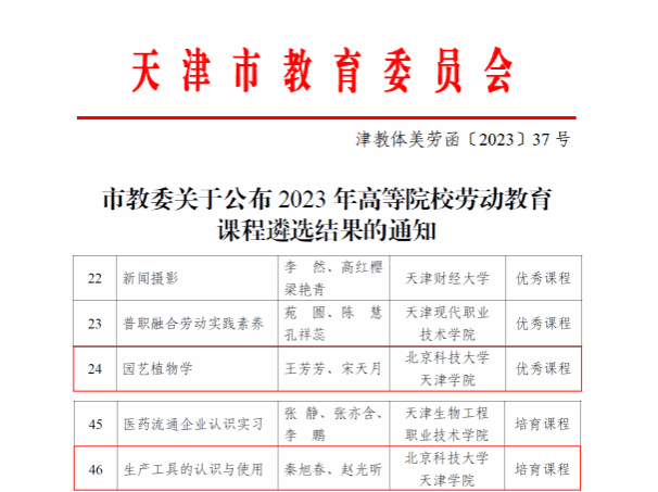 近日,天津市教委公布了2023年高等院校劳动教育课程遴选结果,我院劳动学院王芳芳、宋天月教学团队讲授的《园艺植物学》被评...