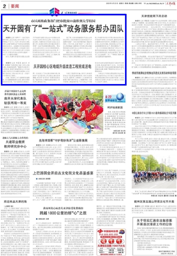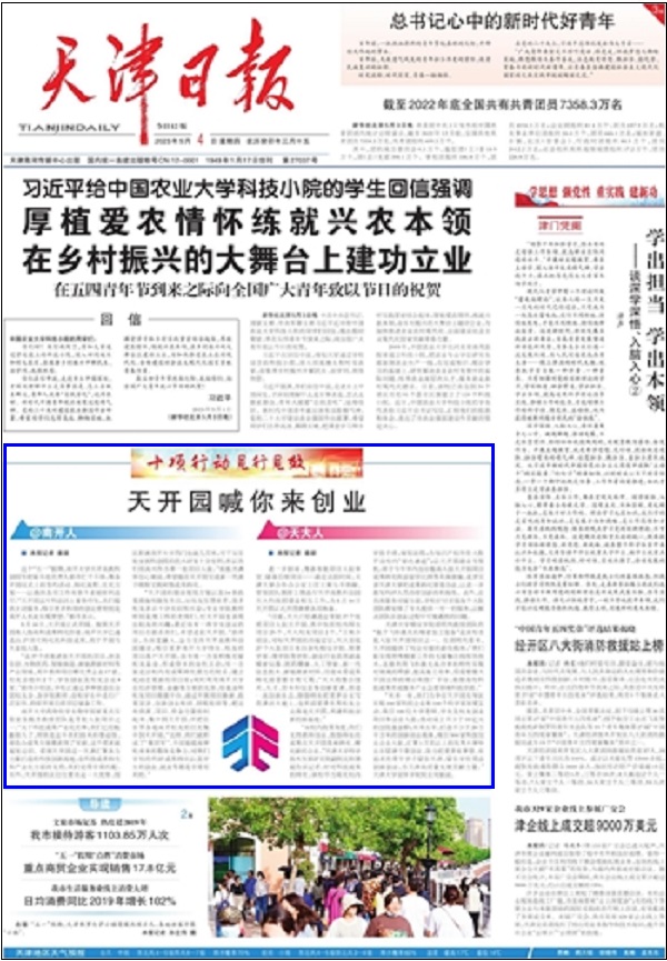 《天津日报》 2023 年 5 月 4 日 01 版 进一步招商、筹备首批项目入驻事宜、储备后续项目……最近这段时间,天津大学合作办公室主任王寒马不停蹄,带领团队倒排工期进行天开高教科创园天大科技园建设相关工作,为5月...